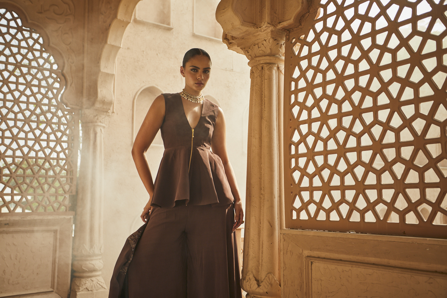 A stylish chocolate brown co-ord set featuring a peplum top with a plunging neckline and matching wide-leg palazzo pants, complemented by a gold-embroidered shrug.