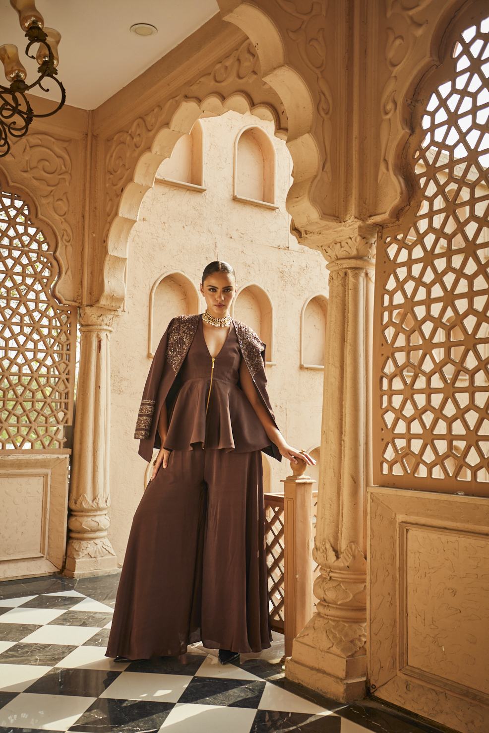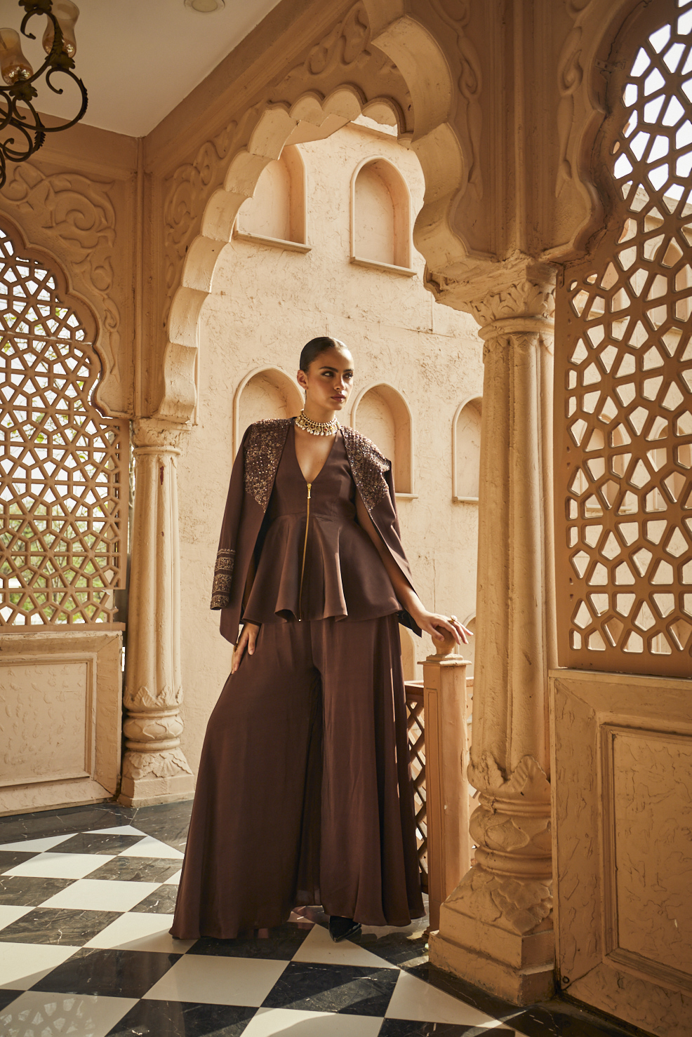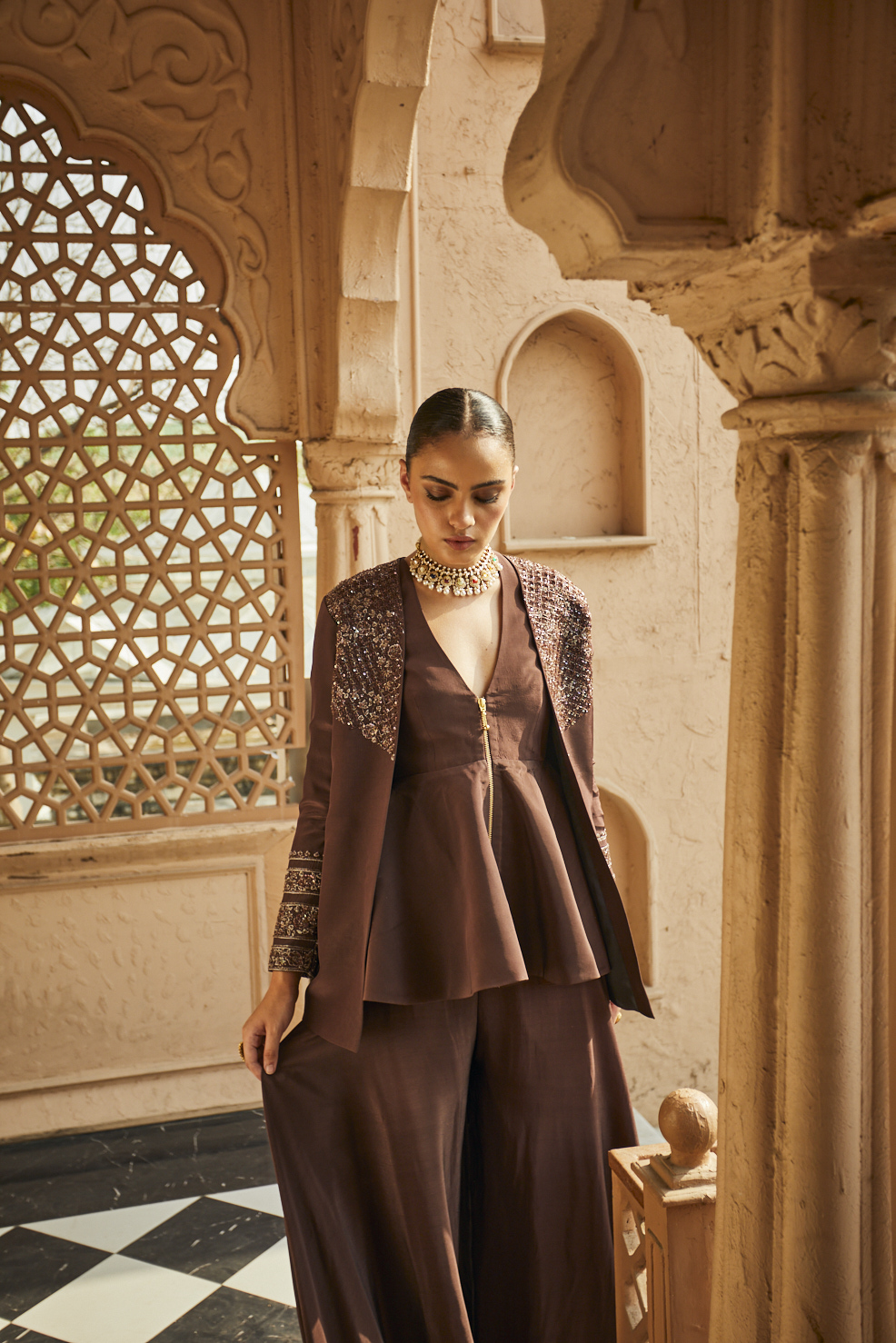 A stylish chocolate brown co-ord set featuring a peplum top with a plunging neckline and matching wide-leg palazzo pants, complemented by a gold-embroidered shrug.
